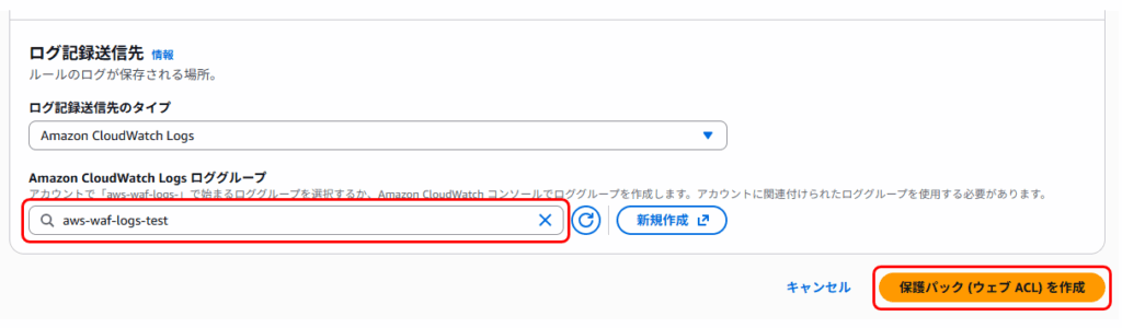 最後にログを取得する場合はロググループを選択して「保護パック(ウェブ ACL)を作成」ボタンをクリックします。CloudWatch Logs ロググループは、「aws-waf-logs-xxx」の形式で作成しておくと自動的に表示されます。