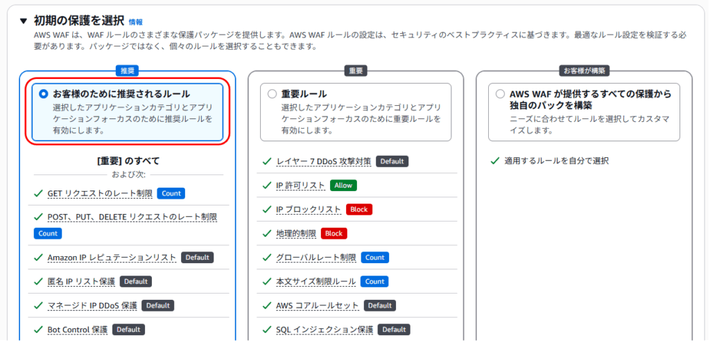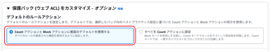 デフォルトのルールアクションを選択します。いきなり WAF でブロックするのではなく、まずは Count で WAF ルールの挙動を確認する場合は、「すべてを Count アクションに設定」を選択します。本番環境の場合は、まずは Count アクションから動作確認をした方が良いと思います。