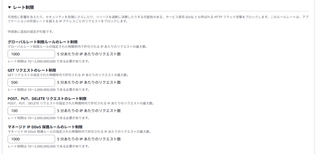 デフォルトで「レート制限」の設定が入っています。下図のような設計ですが、特に極端な設定ではないのでこのままで良いと思います。