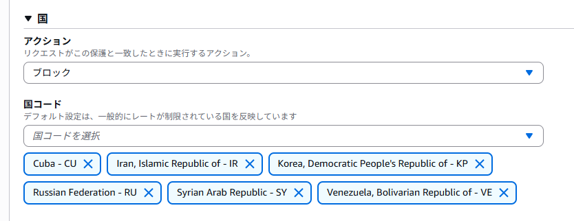 ブロックしたい国を選択します。下図はデフォルトでブロックされている国です。確かに国家としてクラッキングをしていそうな国々ですね。