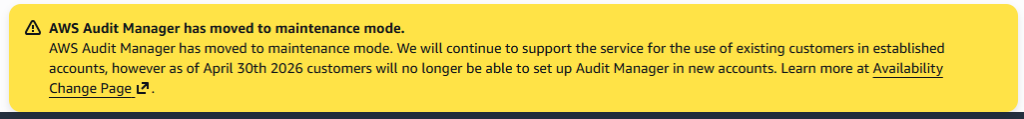 AWS Audit Manager has moved to maintenance mode. We will continue to support the service for the use of existing customers in established accounts, however as of April 30th 2026 customers will no longer be able to set up Audit Manager in new accounts. Learn more at Availability Change Page .